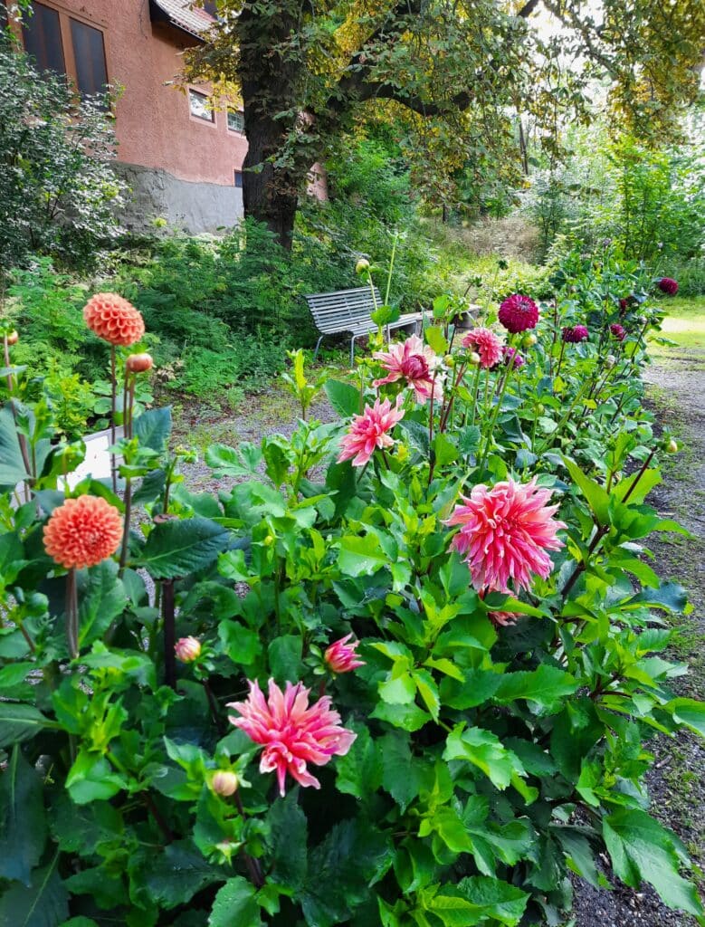 Utsikt över Årstaviken. En liten grupp från föreningen Dahliaentusiasterna fick en guidad tur på Södra Årstalundens Koloniträdgårdar. Det var intressant att se hur olika trädgårdarna var, en del satsar mest på grönsaker, andra på blommor, eller lite av varje. Vi avslutade med fika med hembakt på kolonins skördefest.