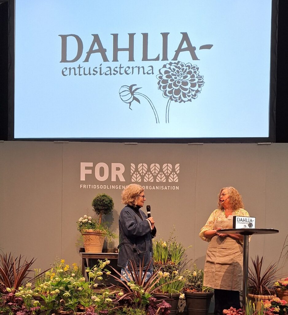 Dahliaentusiasternas monter var välbesökt och vi sålde medlemmarnas överskott på knölar och även rotade sticklingar. Vi fick många givande diskussioner med intresserade personer som frågade om råd. Vi visade några exempel med plantor som drabbats av sjukdomar som ju många undrar över. Jenny Holm höll ett mycket bra och välbesökt föredrag ”Jennys bästa tips” på